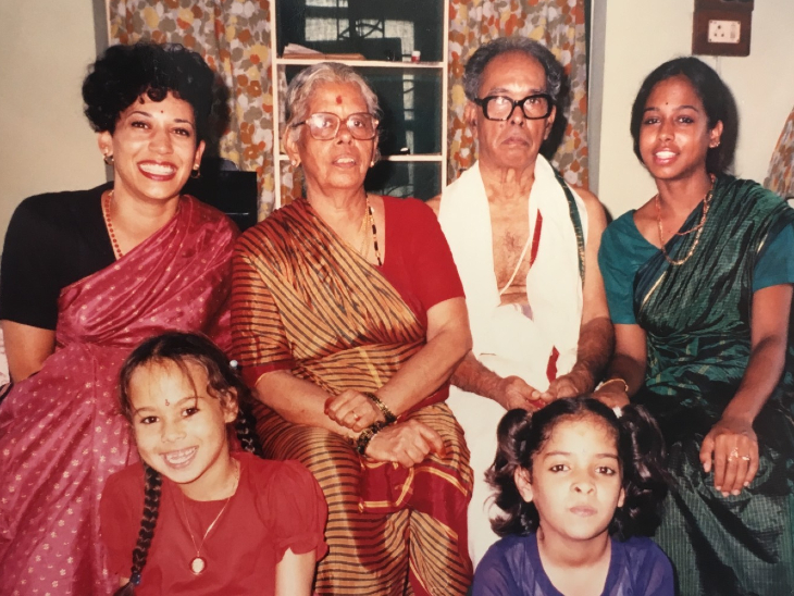 Kamala Harris (in red sari) with her grandmother Rajan Gopalan, grandfather PV Gopalan and sister Maya Harris.