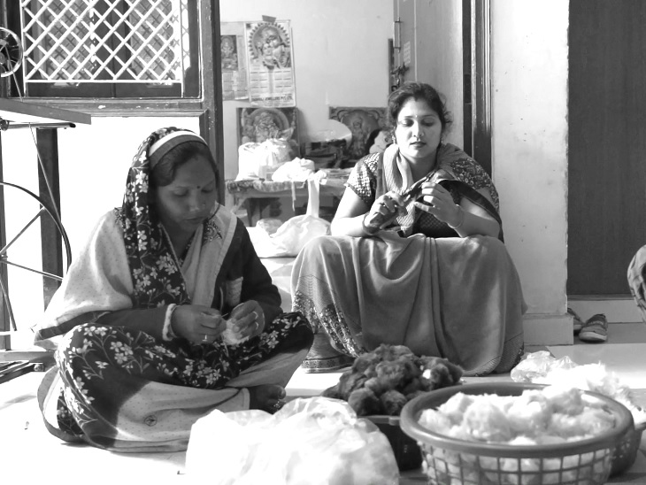 Women making things out of the fiber that comes out after processing cigarette waste.