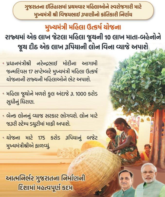 Minister Vijay Rupani will report this plan on the event of the birthday of Pradhanmantri Narendra Modi Ji. Under this plan government will give intrigue free advance office to ladies self-improvement gatherings. Gujarat mukhymantri Mahila Utkarsh Yojana will give an advantage to around 2.51 lakh Sakhi mandals enlisted in rustic territories.