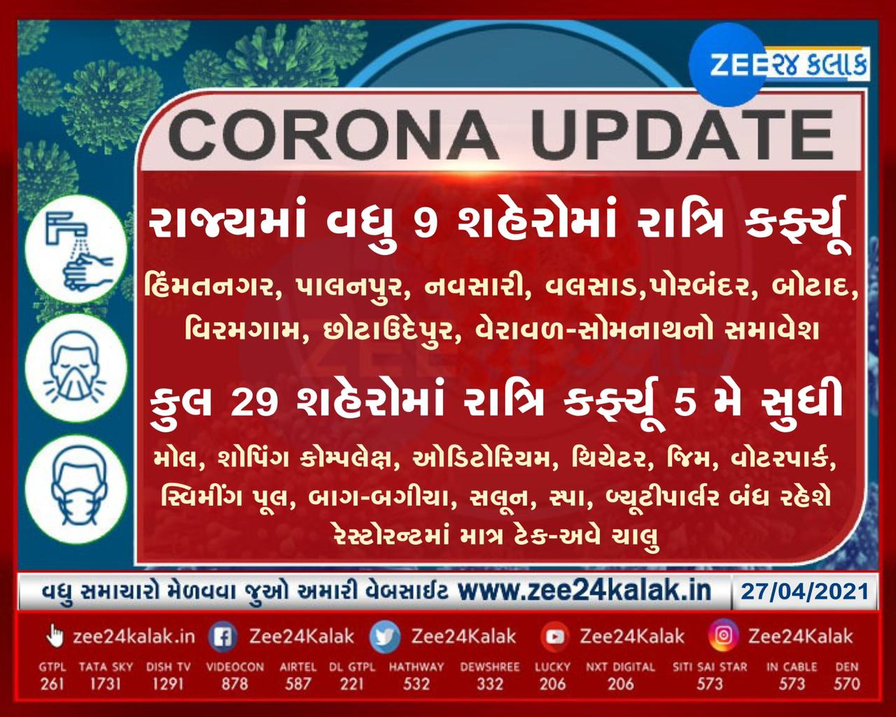 Earlier, curfew was imposed in 20 cities, including 8 metros, from 8 pm to 6 am. Now in addition to those cities, a total of 29 cities including Himmatnagar, Palanpur, Navsari, Valsad, Porbandar, Botad, Viramgam, Chhotaudepur and Veraval-Somnath will be under curfew from 8 pm to 6 am. In addition, the state government has decided to impose additional restrictions in these 29 cities.