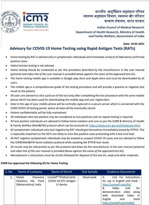 According to a statement issued by ICMR, home testing is for symptomatic patients only or those who have been in direct contact with a confirmed case in the lab.